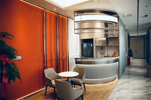 仪式结束后,各级领导及嘉宾一行共同参观了新址环境。瑞金国际新展厅将具有东方意蕴的大理石,与现代灰色调相结合,质感与品味并存。天花流线及圆角柜台设计,以“水流”为灵感,流线形态,搭配天然大理石纹,寓意海纳百川水泽万物,少许吉庆红与活力橙点缀,让整体空间时尚又富有艺术氛围。