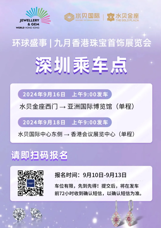 本届JGW分别于9月16日和18日在深圳设有巴士乘车点,十八岁以上珠宝业内人士可扫码下方二维码报名乘车。